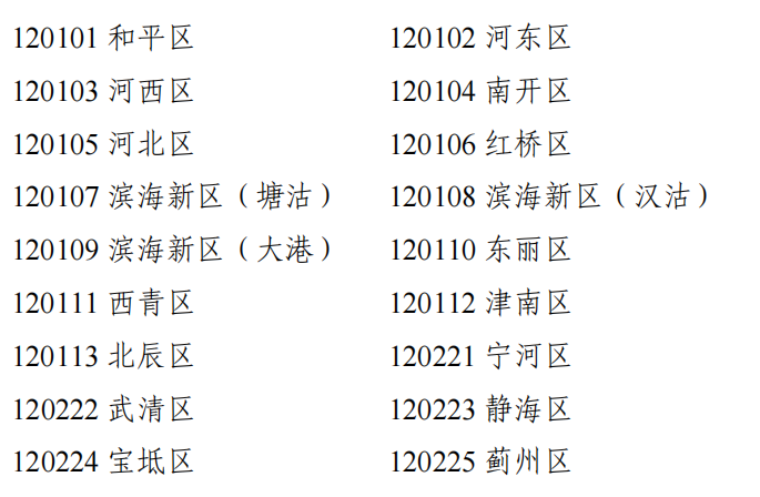 滨海新区(海滨教育中心)使用滨海新区(大港)的行政区划代码120109 ,各类考生的顺序号从7000开始。