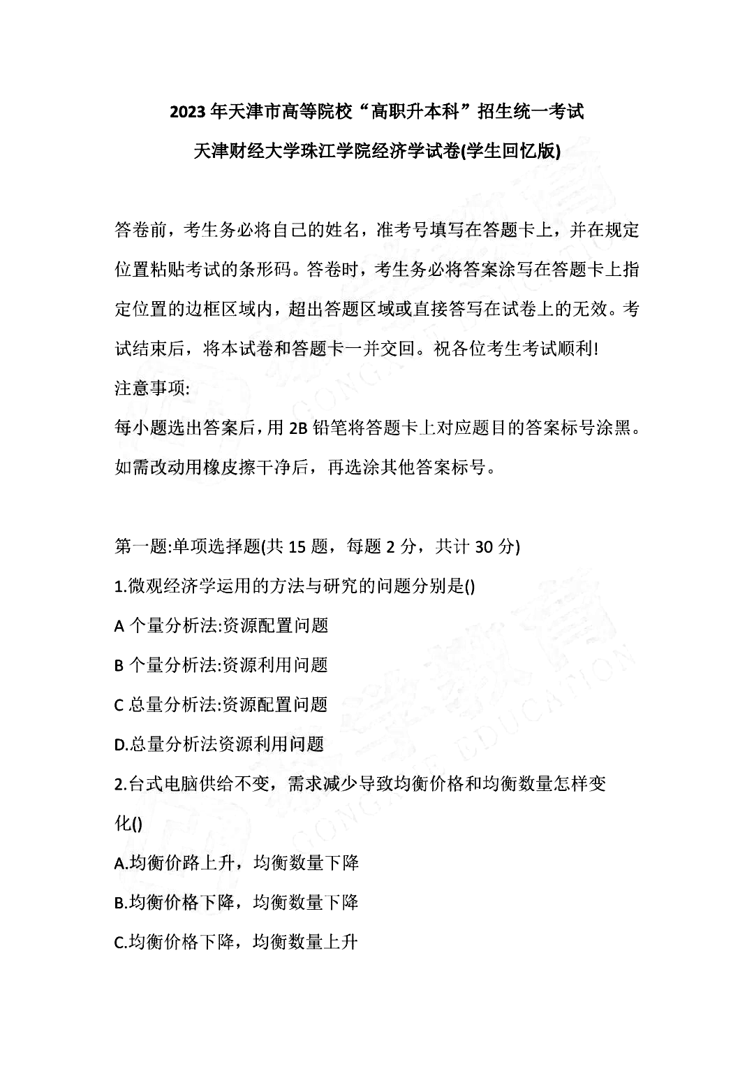 2023天津财经大学珠江学院专升本专业课考试真题分享(经济学部分)