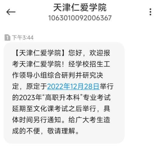 [天津仁爱学院]您好,欢迎报考天津仁爱学院!经学校招生工作领导小组综合研判并研究决定,原定于2022年12月28日举行的2023年“高职升本科”专业考试延期至文化课考试之后举行,具体时间另行通知。给广大考生造成的不便,敬请理解。