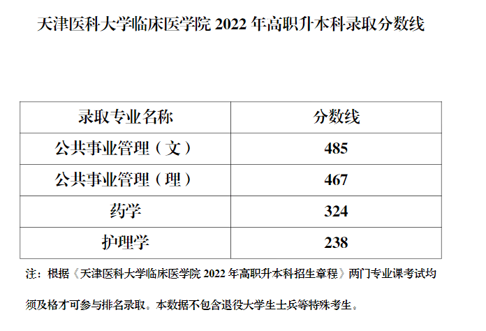 2022年天津医科大学临床医学院专升本录取分数线